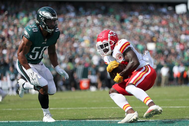 The Chiefs offense presents problems for just about any defense, but there were a few occasions where the Eagles had dubious matchups, including one where Eric Wilson ended up in space with Kansas City’s star receiver Tyreek Hill in the end zone. Hill gained separation from Wilson, who may have been expecting help, with an out-breaking route and caught a touchdown pass from Mahomes.