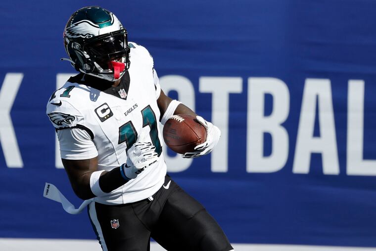 A.J. Brown continues to be Jalen Hurts’ go-to receiver in high-leverage situations. He completed a low-percentage touchdown pass to Brown on fourth-and-3 down the left sideline with Giants backup cornerback Nick McCloud in man coverage.
