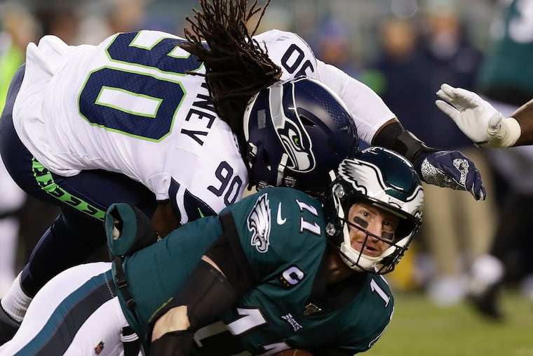 The injury aspect of Wentz’s career is not necessarily what defines it, but that is a big part of his story, and now more so than ever. He hasn’t had an injury-free season since his junior year of college, but the litany of wrist, rib, knee, and back ailments was capped in the January wild-card playoff by a concussion that knocked him out against the Seahawks. It was a bad one.