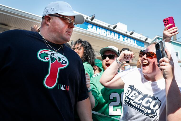 The newlyweds patiently waited at the Ocean Drive for special appearances from past and current players including Kelce, Brandon Graham, Cooper DeJean, Beau Allen, Sydney Brown, Thomas Booker, and Landon Dickerson. Cami Amatucci stood out among the crowd, wearing a “Delco by Marriage” T-shirt and a bride veil.