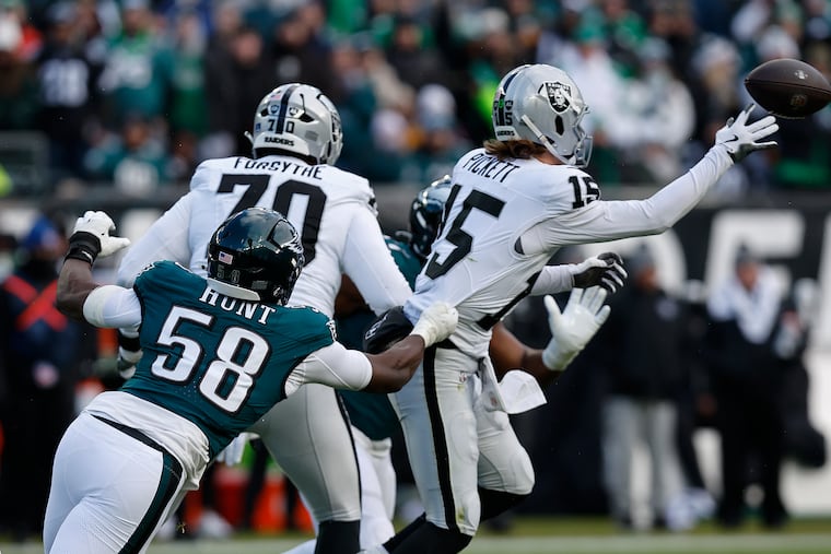 Cooper DeJean had a shaky start, but settled down and made numerous plays vs. the run and pass. He had four tackles and a pass breakup. DeJean allowed a third down conversion when he slipped during the Raiders’ first possession. It got worse for him on the drive when DeJean committed two penalties on the same play — holding and an unnecessary roughness personal foul — but the Eagles eventually held.