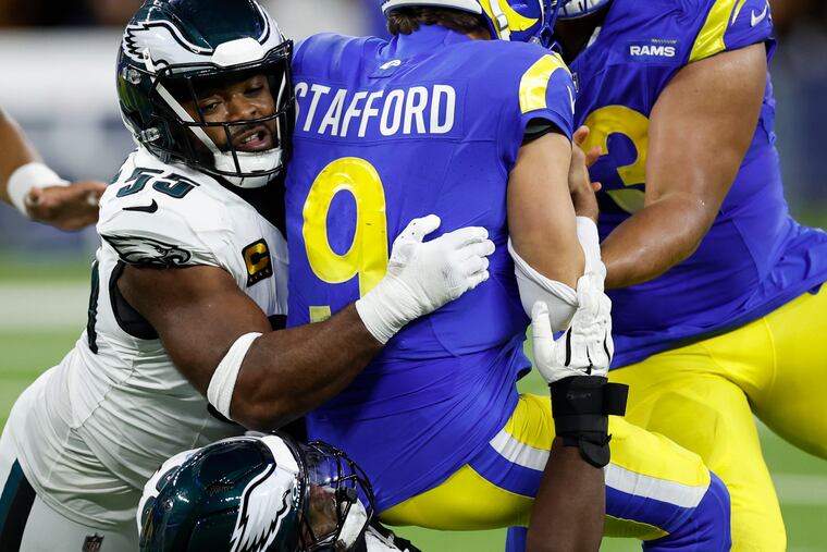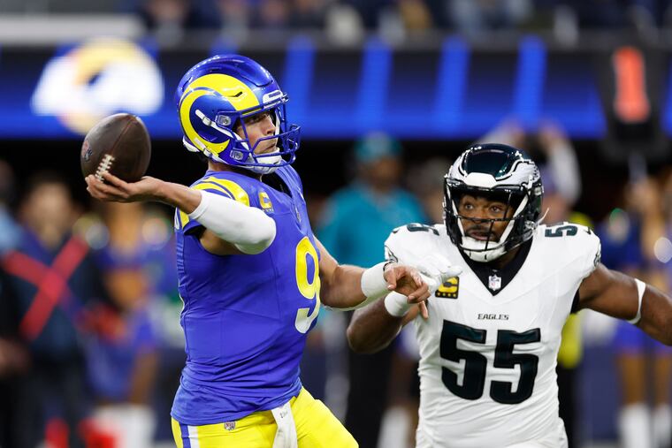 On a bizarre sequence at the end of the half, the Eagles turned the ball over on downs on fourth-and-7 at the Rams’ 48-yard line on a Hurts keeper that lost four yards. With two seconds remaining in the half, Josh Sweat sacked Stafford, preventing the Rams from making a Hail Mary attempt.