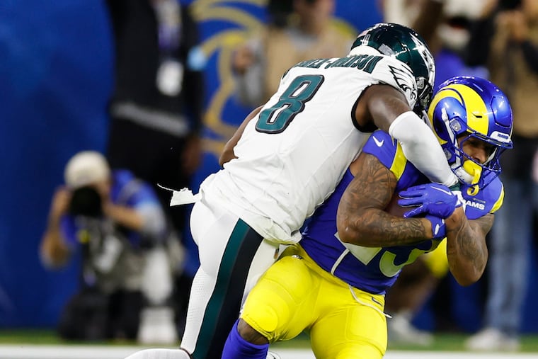 Isaiah Rodgers, filling in for Darius Slay after the veteran cornerback went to the locker room with an injury, was charged with a pass-interference penalty at the Eagles' three-yard line. Running with Los Angeles receiver Puka Nacua downfield, Rodgers got a handful of the second-year wideout's jersey just before the ball arrived. Two plays later, Rams receiver Demarcus Robinson got a step on Rodgers in the front corner of the end zone for a two-yard touchdown catch.
