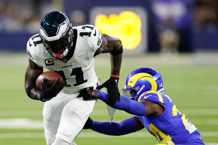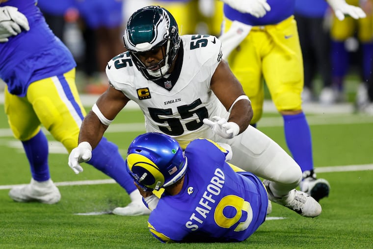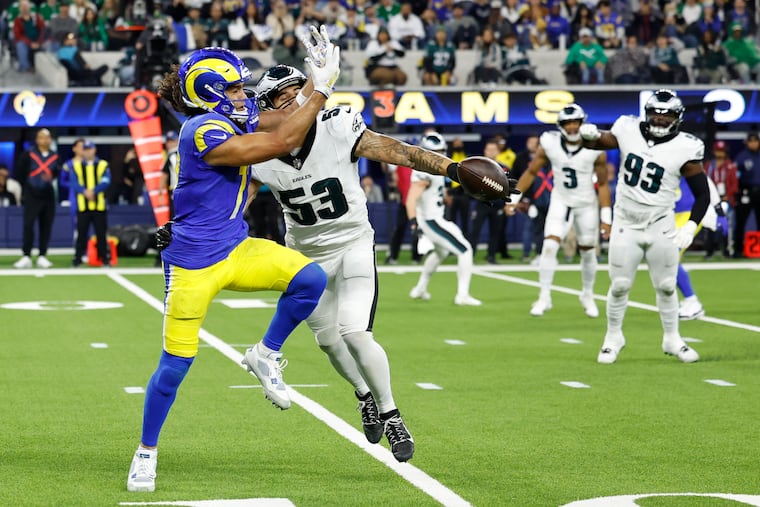 The Eagles’ first touchdown of the night put them up, 13-7, with a minute and a half left in the first half. Nakobe Dean quelled the Rams’ attempt at a response on the ensuing possession, bowling over Rams running back Kyren Williams on a blitz and sacking quarterback Matthew Stafford on second down.