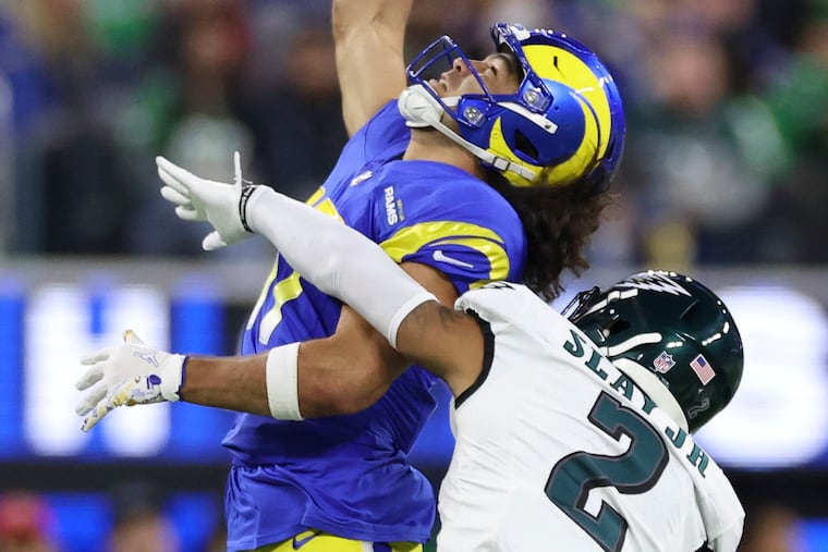The Eagles went with Isaiah Rodgers in Slay's spot at outside corner opposite rookie Quinyon Mitchell. The Rams had success testing Rodgers quickly in Slay's absence, drawing a pass-interference penalty on the 26-year-old and finding receiver Demarcus Robinson in the end zone for a two-yard touchdown a couple plays later.