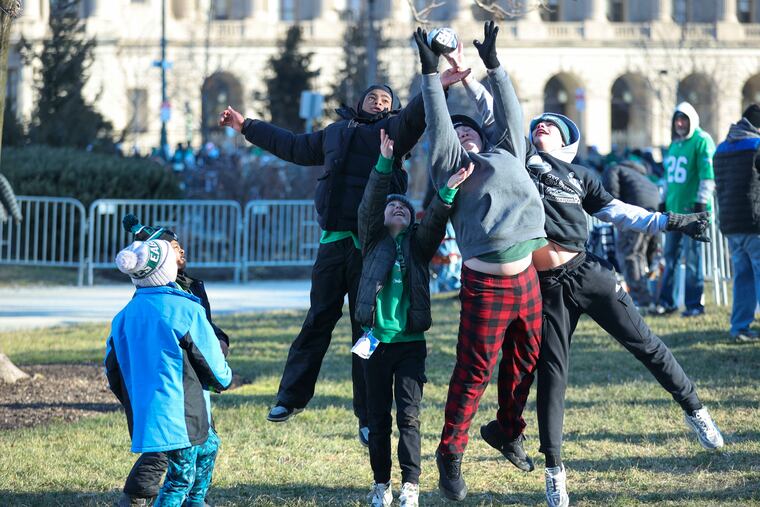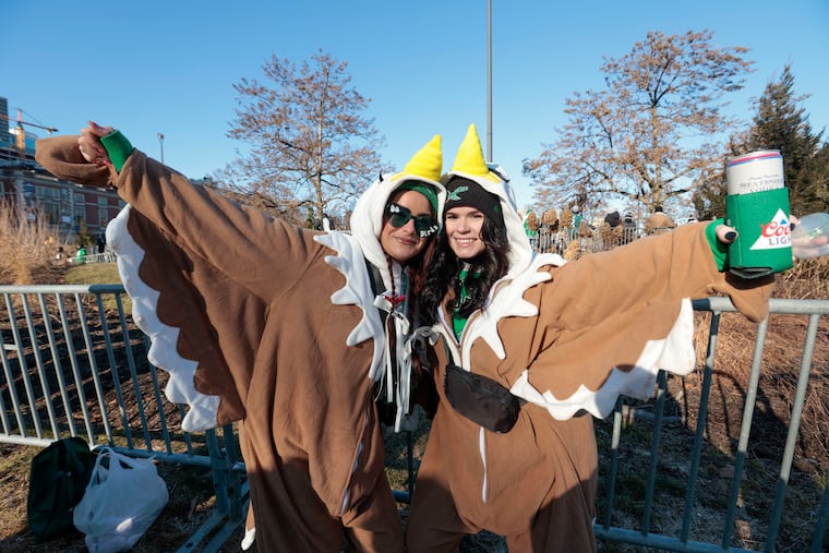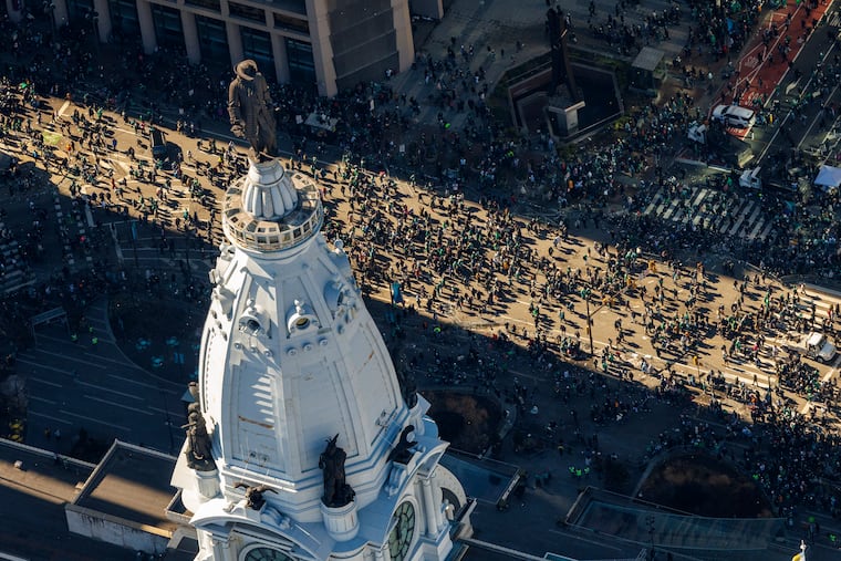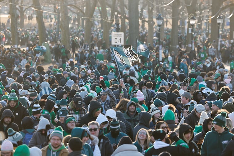 Honking horns, Eagles chants, and the intermittent “Go Birds!” filled the air as a sea of green migrated east around 7:30 a.m., headed toward Center City from 30th Street Station .