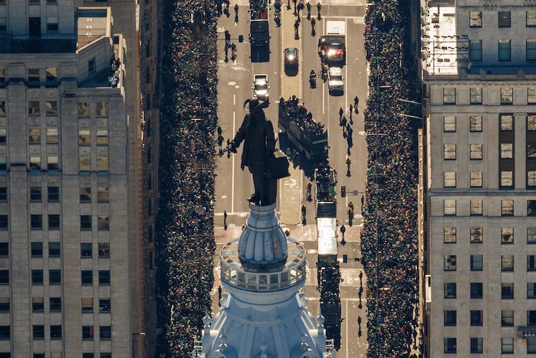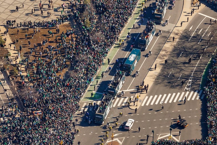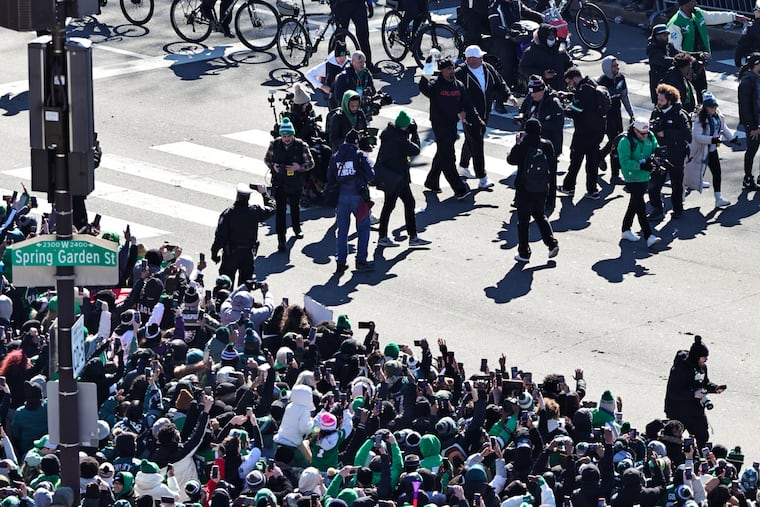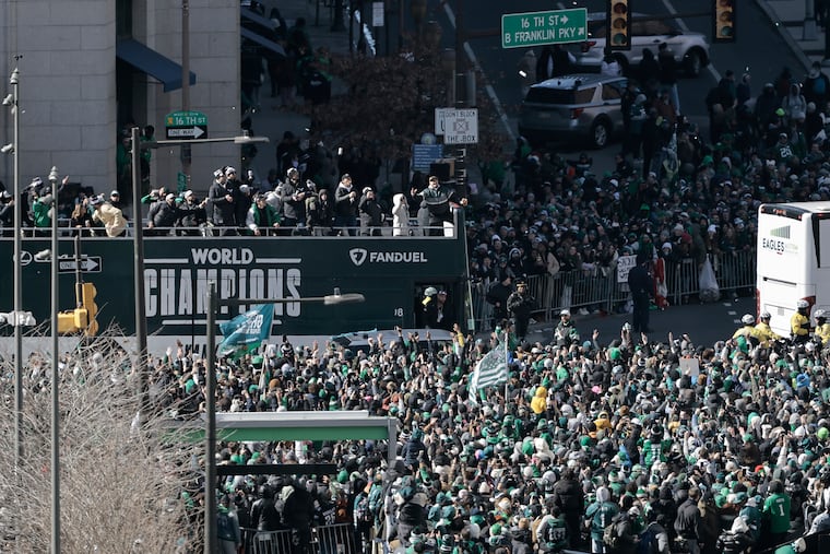 The evacuating crowds still screamed at the sound of Saquon Barkley’s name and sang “We Are The Champions” with the players as they made their way up the Parkway toward Center City.