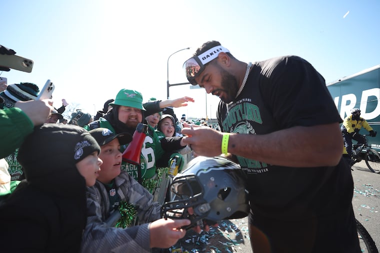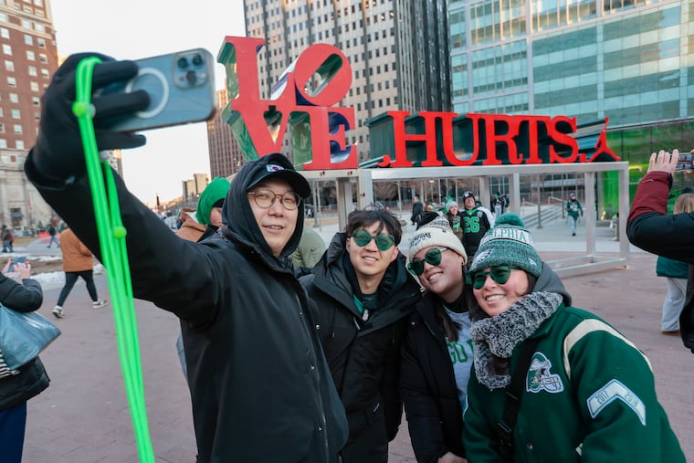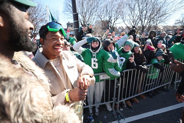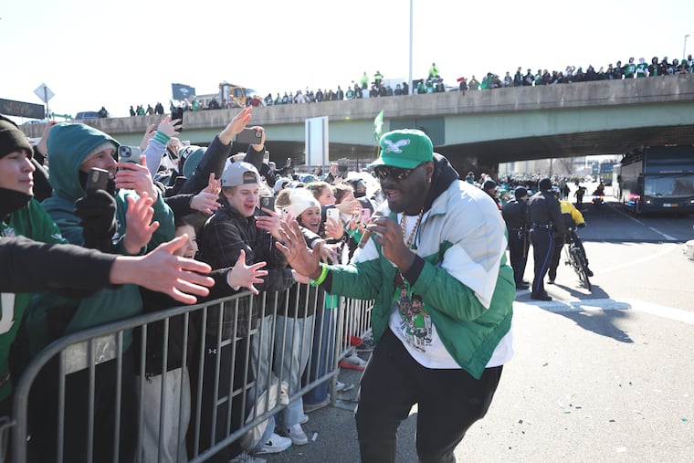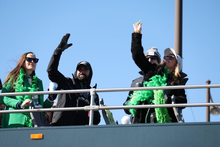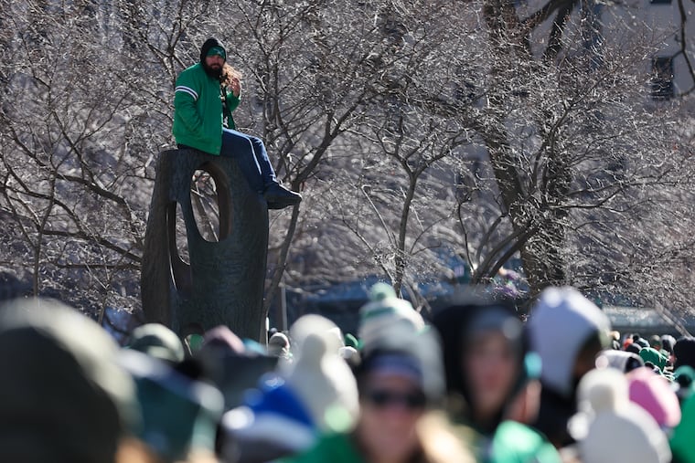 “Love Hurts” signs were ubiquitous at the Super Bowl parade celebration. Saquon Barkley slapped hands with fans reaching over a barrier and celebrated with a 3-year-old. Green-clad fans showed up pushing the sartorial limits, including one in a three-piece, homemade Eagles-themed suit.