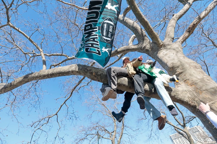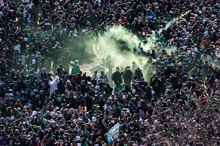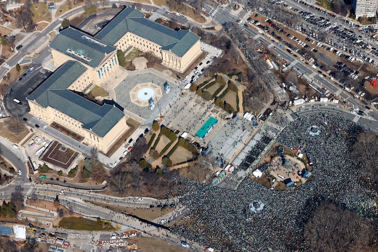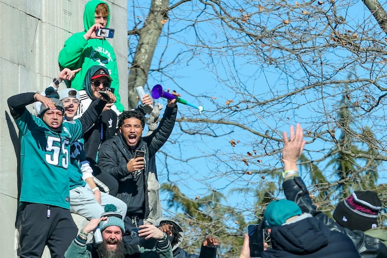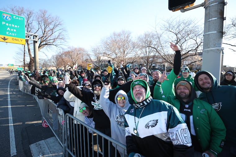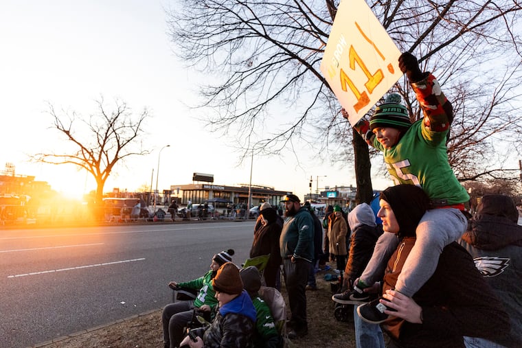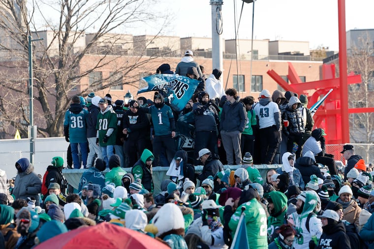 Eagles fans swarmed the streets to take in the Super Bowl victory parade, camping out all day as the team made its way from the sports complex in South Philadelphia to the Philadelphia Museum of Art.