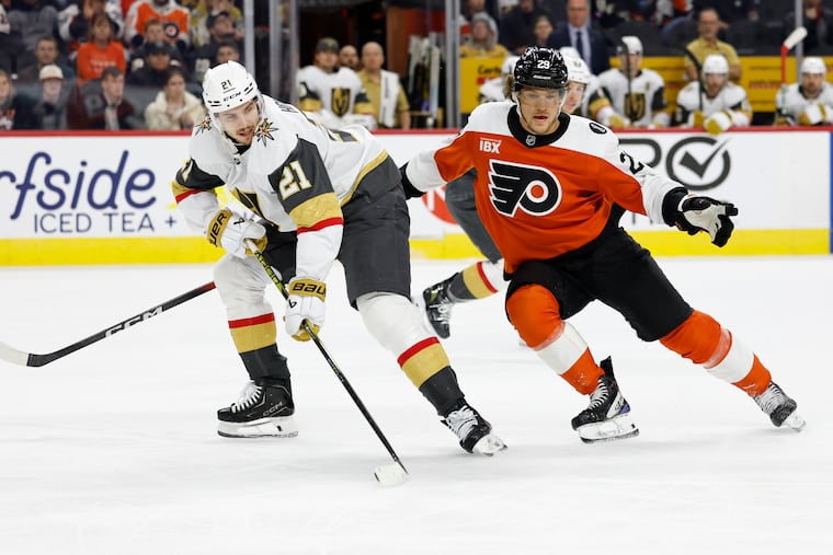 Travis Konecny fanned on the puck in the Flyers’ zone during the extra period, and Vegas’ Jack Eichel got it before ultimately finding Mark Stone crashing backdoor for the overtime game-winner.