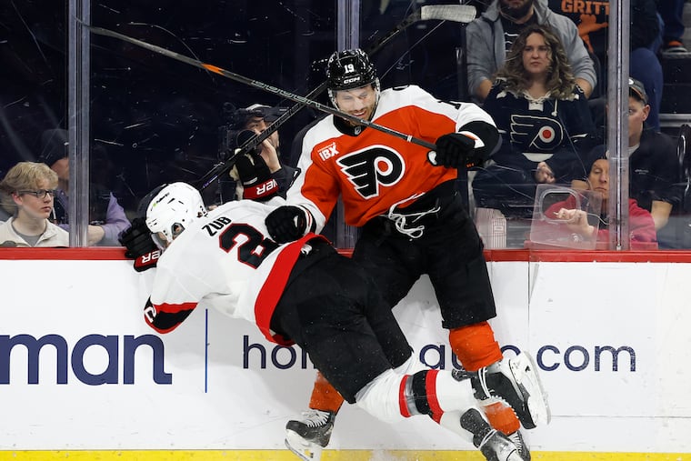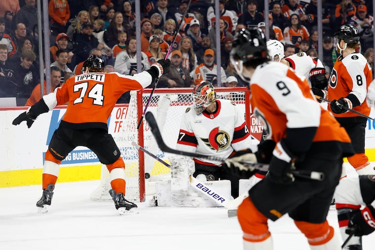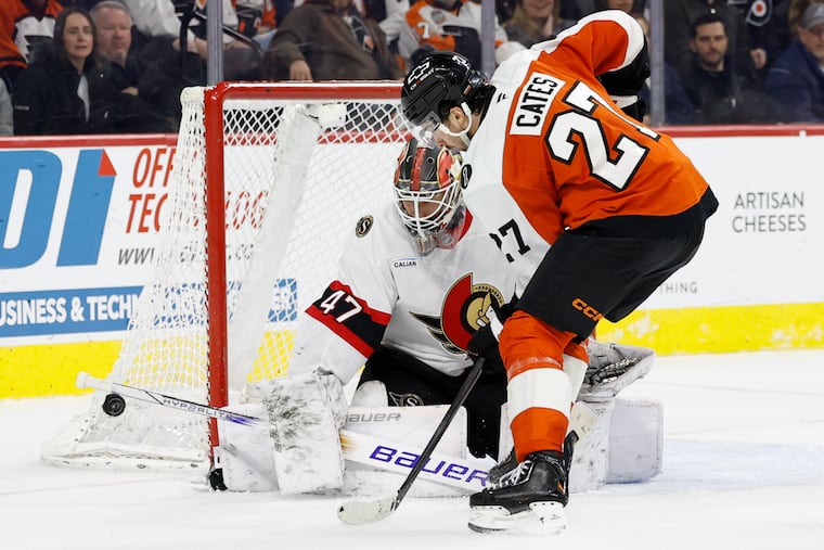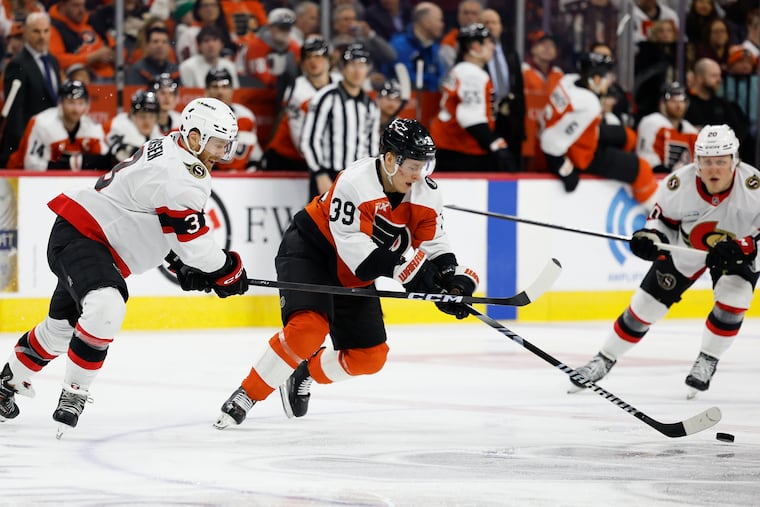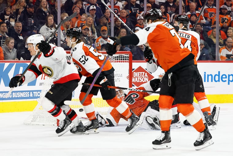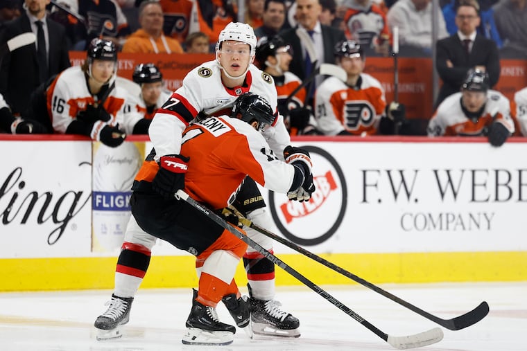 The Flyers got their best offensive possession of the game late into the second — with a little assist from Senators’ center Dylan Cozens’ skate blade, which fell off on a blocked shot, making it basically a power play.