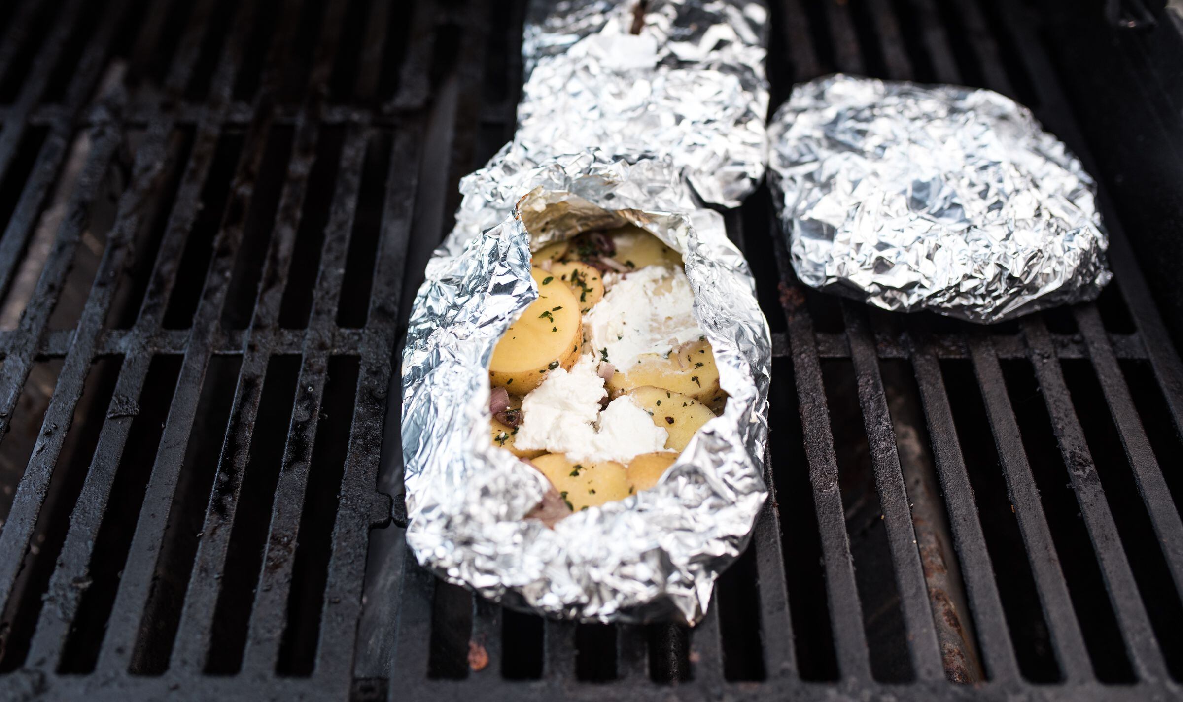 Because you never really know how long you may have to grill (uncooperative weather, eager grillers lining up to take over your space), plan to minimize the time you need on the grill. This means avoiding fussy grilled sides in favor of those that will fit into the time it takes to cook your main course. For instance, tin-foil-pocketed potatoes from Food 52’s Any Night Grilling cookbook can be fully prepped in advance. Then, by the time you’re at the grill, all that’s left to do is place the packets on the fire and let them cook over indirect heat.