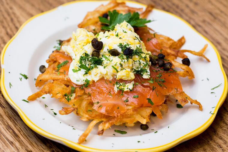 So for Cahn, who recently whipped up a few festive dishes to add to a Hanukkah table, that means it’s all about the toppings. Behind the lunch counter of his 11th Street restaurant, Cahn suggested trying a breakfast-for-dinner spin on a latke, topping it with fluffy scrambled eggs, parsley, and a pile of pale pink lox. He added pan-fried capers to give the dish a briny crunch.