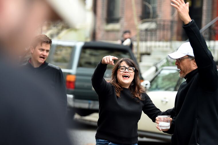 Residents of St. James Place in Philadelphia hold a neighborhood karaoke with some coronavirus-mandated socially distanced "stoop singing" and dancing in the street on Sunday.