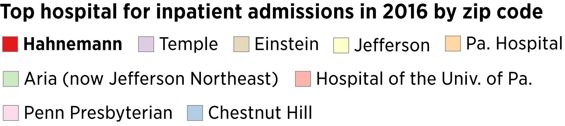 Hahnemann University Hospital was the top pick for inpatient admissions in four of Philadelphia's 48 zip codes, and ranks sixth citywide among the nine hospitals with comprehensive emergency-room services.