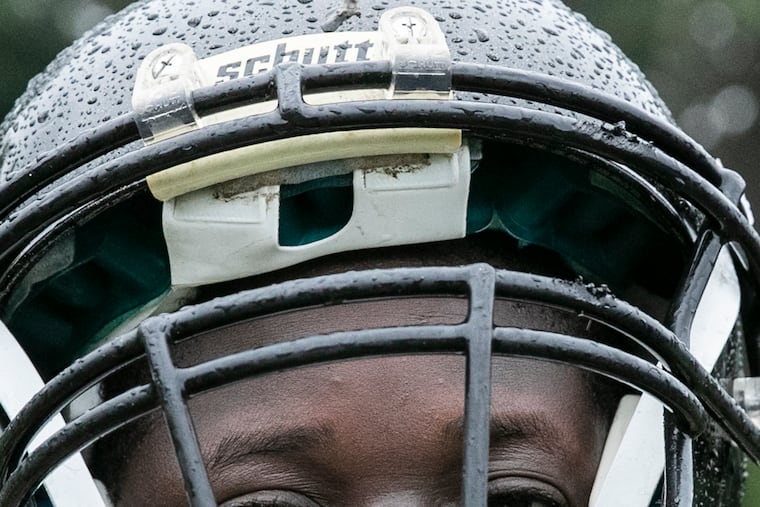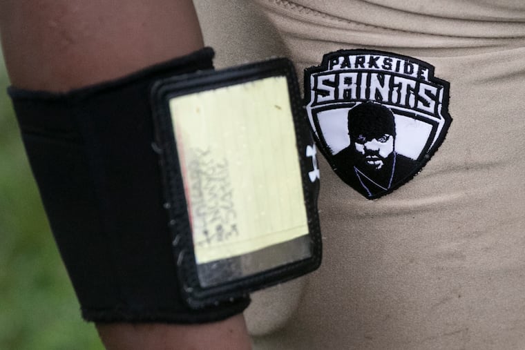 Under a blanket of rain, players and coaches of the Parkside Saints football team trot onto the field. Elick Barnes, a.k.a. Coach Bo, adjusts a player’s bright orange mouth guard, while another tucks the 12-year-old quarterback’s shoulder pads into his gold jersey.