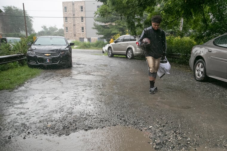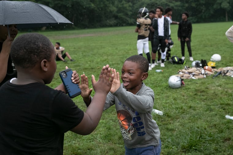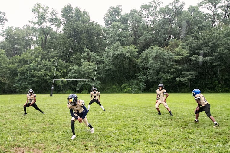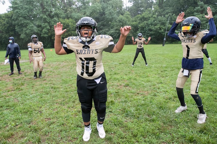 The unrelenting rain doesn’t dampen the energy in the Saints’ scrimmage against the West Philadelphia Panthers. Coaches pace along the sidelines and yell plays as the Panthers hammer them into their territory. Younger siblings practice handshakes and long tosses on the sidelines, gliding through the mud for a catch.
