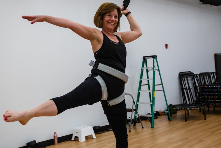 “The support of the bungee helps me get into positions I otherwise couldn’t do and also deeper into things like squats,” said Wynnewood resident Lynne Gatz, 43.