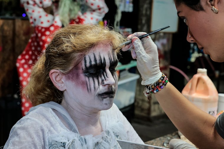 But inside, the dressing room is bustling with about 40 haunters running around in makeup and costume. Some performers adjust their costumes as others get their makeup done. A ghost and clown chat excitedly about the night ahead.
