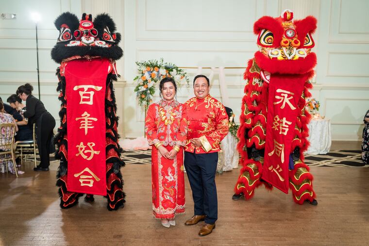 The two later changed into traditional Chinese wedding outfits and treated their 200 guests to a traditional lion dance performed by the Penn Lions.