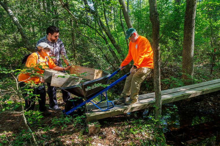 About 50 miles away, Frank Carr, 68, was helping volunteers with the Outdoor Club of South Jersey haul pressure-treated lumber weighing up to 100 pounds through a trail at Batsto Village in the Pinelands. On a cloudless day, the group lugged lumber on their shoulders, cajoled wheelbarrows over roots, and straddled shaky log bridges. When the crew was finished, hikers had 130 feet of new bridge to cross a swamp.