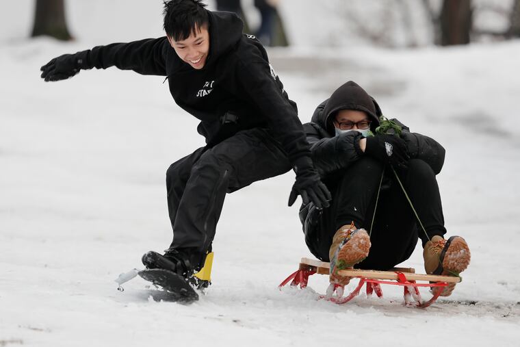 Brian Nguyen (left) and Jacob Chim race down the snow-covered hill behind the Philadelphia Museum of Art on Feb. 7. While the museum’s front steps, which face the Benjamin Franklin Parkway, are one of the city’s most visible sledding destinations, the long, hidden slope behind the grand building has plenty of its own enthusiastic devotees.