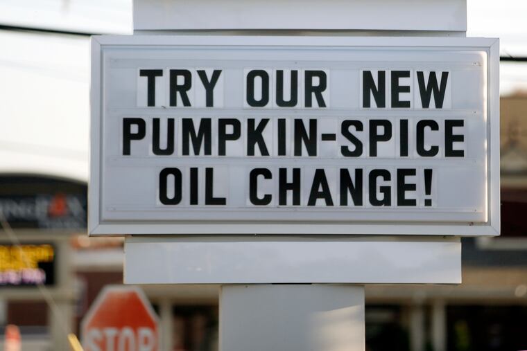 This seize-the-moment promo sign was posted outside the Valvoline Instant Oil Change on the South White Horse Pike in Magnolia, Camden County. If pumpkin spice is good enough for coffee, room deodorizer, candles, shave soaps, and linen sprays, who not for car engines, too?