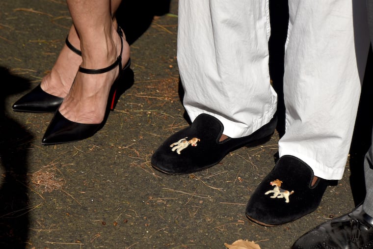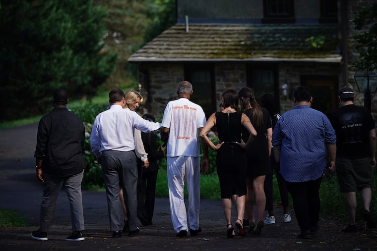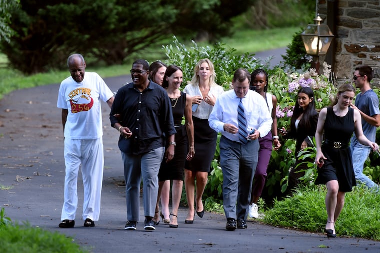 Returning to his Elkins Park estate, Cosby eventually emerged to greet supporters gathered outside the gates. Leaning on one of his lawyers for support, and dressed in a Central High T-shirt and velvet shoes with dogs embroidered on them, he flashed a V-for-victory sign but declined to address the crowd.