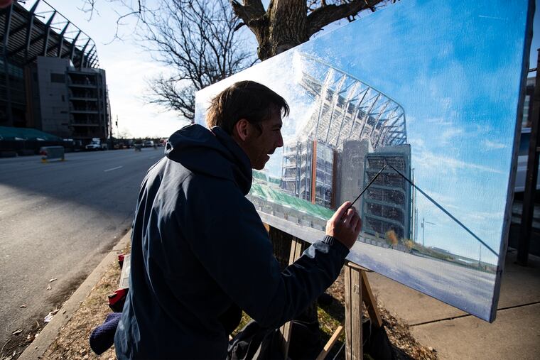 Smith, 41, a retired pro-skateboarder-turned artist, started painting outdoors across the street from the Linc in September, just to see if he could fit the enormous home of the Philadelphia Eagles into one composition.