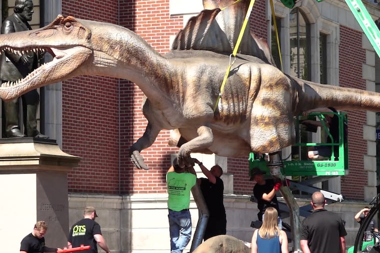 Just after sunrise on Wednesday morning, a Spinosaurus was found staring down cars and bystanders as she trekked from Somerdale, N.J., to the Ben Franklin Parkway. Along the way, the 2,100-pound dinosaur swiveled heads down I-295, around City Hall, and in front of the Philadelphia Museum of Art.