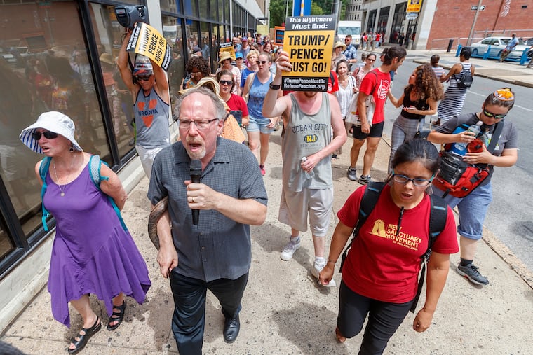 On Monday, Rabbi Shawn Zevit, with microphone, led the chants as a large group of protesters circled the block where ICE headquarters is located in Center City, part of a protest against the threat of mass arrests and deportations by the Trump administration.Read moreMICHAEL BRYANT / Staff Photographer