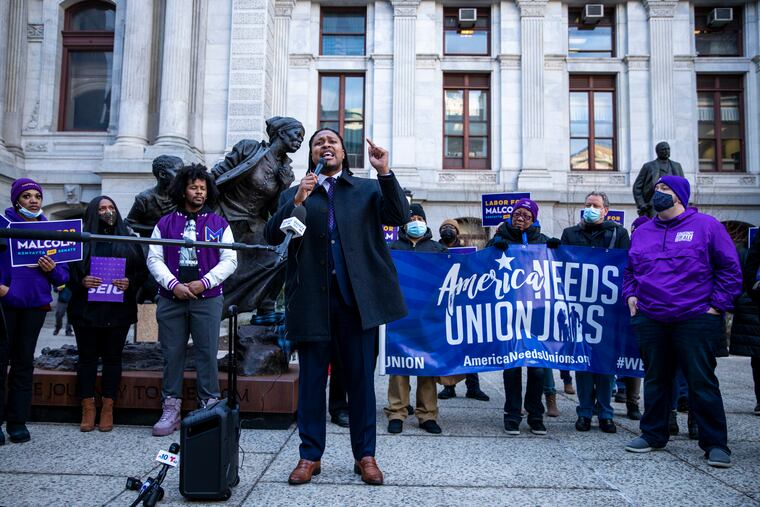 SEIU Pennsylvania, which represents 80,000 workers — including health-care workers, security guards, and food-service employees around the state — backed Kenyatta at a news conference outside City Hall attended by members clad in their signature purple and yellow, holding “Labor for Malcolm” signs.