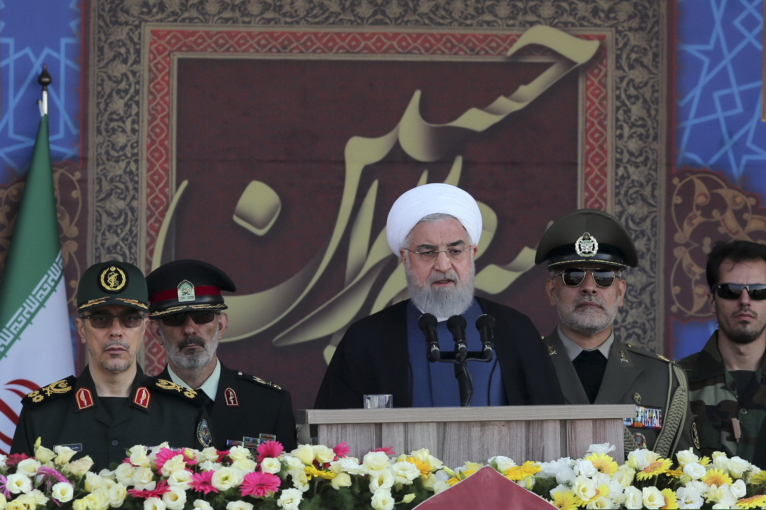 Rouhani spoke from a riser at the parade in Tehran, with uniformed officers from the country's military and its paramilitary Revolutionary Guard beside him. The cleric later watched as goose-stepping soldiers carrying submachine guns and portable missile launchers drove past as part of "Holy Defense Week," which marks the start of the Iran-Iraq war in 1980.