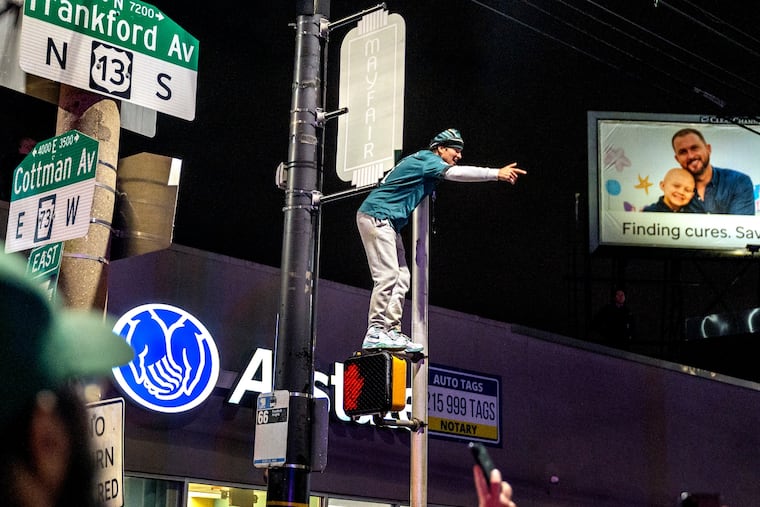 “Climb the pole,” the crowd chanted as police arrived, detaining at least one aspiring pole-climber. The roof of a SEPTA bus stop pavilion collapsed beneath the feet of several people who had climbed atop it. The extent of the injuries was not known.