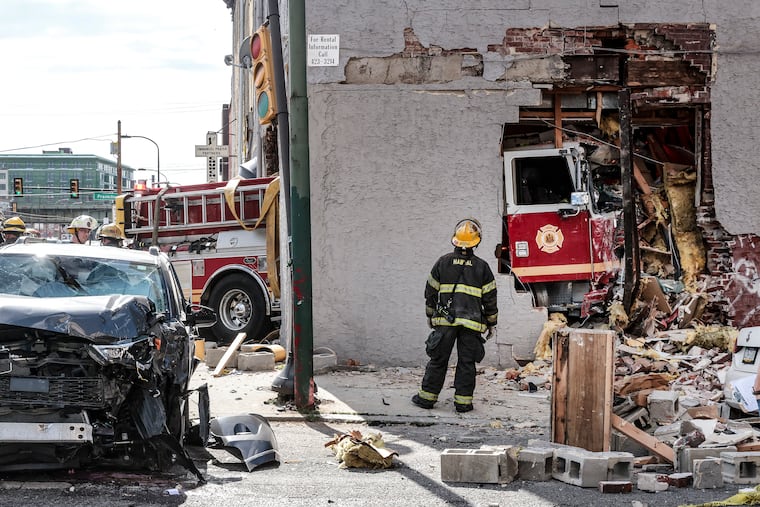 The impact sent the fire engine into the building at the corner of Girard Avenue and Seventh Street.