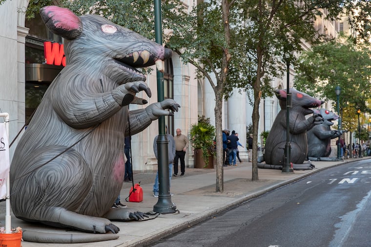 It was a typical morning in Philadelphia. Clusters of tourists took selfies in front of Independence Hall. Others sat on benches reading glossy brochures. But some pedestrians were taken aback by the three towering inflatable rats with bloodshot eyes across the street.