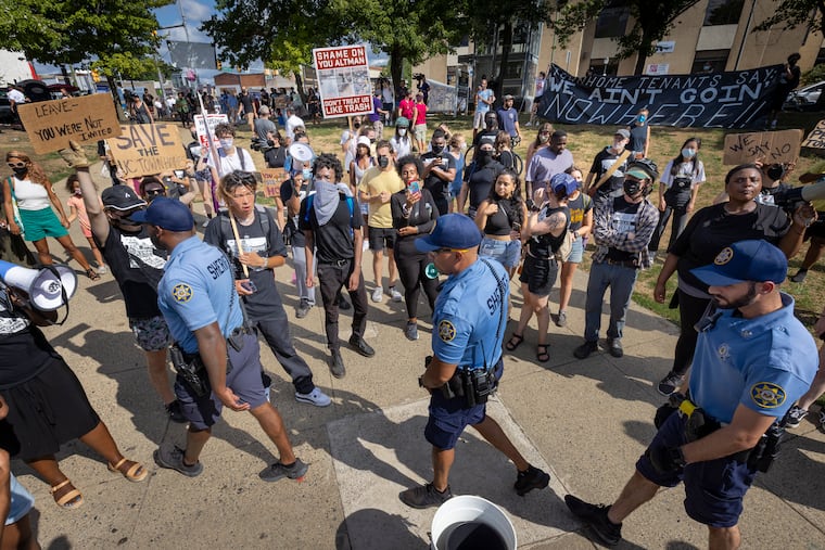 Sheriff’s officers cleared out an encampment at University City Townhomes on Monday morning, as West Philadelphia residents and supporters protested the displacement of 69 households from the complex, which is being sold.