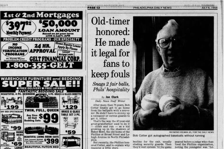 In 1929, Bob Cotter spent the night in the House of Correction for catching a foul ball at a Phillies game.