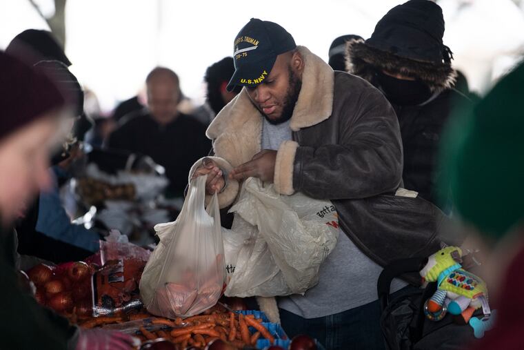 Federal workers gathered quietly in the semi-darkness beneath I-95 in South Philadelphia on Wednesday morning, solemnly collecting charity carrots, apples, and other items during an emergency food distribution hastened by the month-long partial government shutdown.