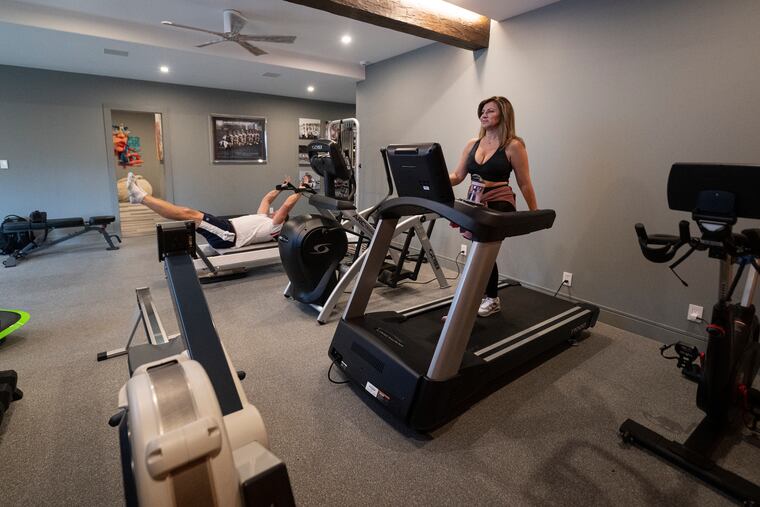 Danielle and Mike McCoy of Jenkintown started taking virtual fitness classes when their gym closed. Now they have gym equipment in their new home, which also has a full basketball court.