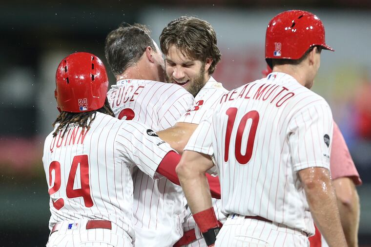 His teammates mobbed Bruce after he rounded second base. Roman Quinn, who ran for Rhys Hoskins after Hoskins started the inning with a walk, scored easily. J.T. Realmuto followed Hoskins with a single and leaped into the air to celebrate with Bruce. Edgar Garcia, the rookie reliever who earned the win with a perfect 10th, doused Bruce with water.