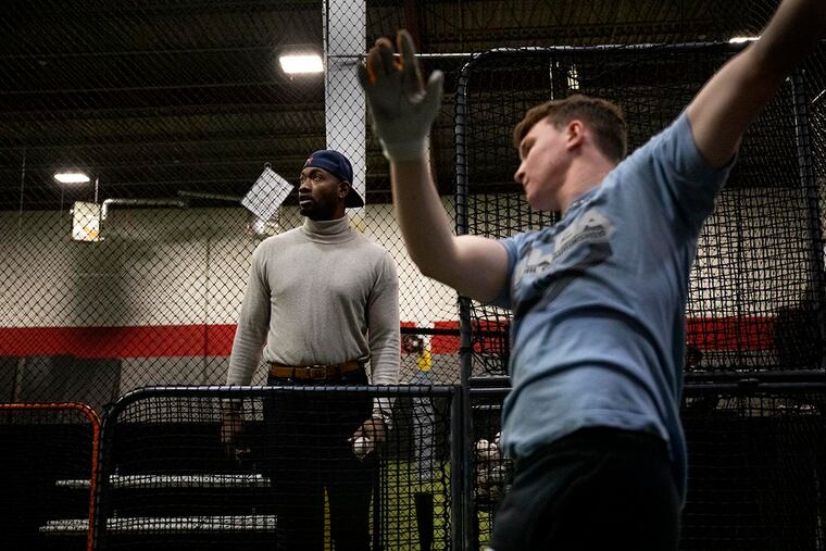 In one corner of Athletes Academy, a sports-training facility in East Norriton, Domonic Brown was back in a batting cage Tuesday afternoon. Yes, that Domonic Brown. His head and eyes flitted back and forth from Max Hitman — a senior at Archbishop Carroll, a St. Joseph’s University recruit, and Brown’s star pupil — to a computer screen above the cage, to a HitTrax program showing the data of Hitman’s every swing off a batting tee: his bat speed, the ball’s exit velocity, the distance it would have traveled. One of Hitman’s cuts produced a piercing sound, like pipe on pipe, and what would have been a 194-foot line drive to left-center field. “Not bad,” Brown said. In another corner of the facility, Domonic Brown Jr., age 2, kept shooting a little basketball through a little basketball hoop. He couldn’t miss. His dad was supposed to be like that, too.