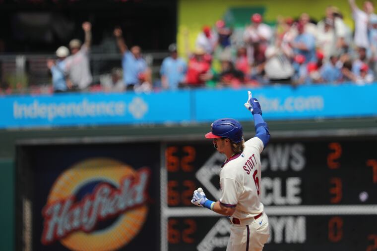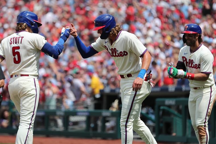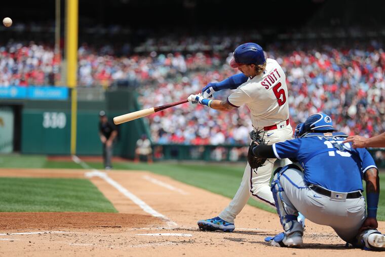 The Phillies’s 12-hit attack Sunday featured three home runs, including two-run shots by veterans Kyle Schwarber and Nick Castellanos. Bryson Stott hit the first one, a three-run shot in the first inning that tied the game after the Royals had jumped to a 3-0 lead. Schwarber snapped an 0-for-19 drought with his homer in the second inning, and Castellanos’ shot came in the fifth.
