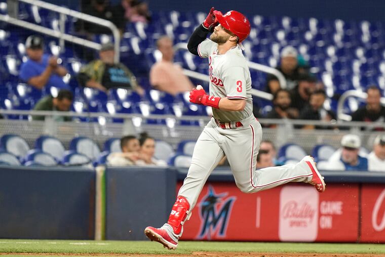 MIAMI — As he circled the bases for the 100th time since signing the biggest free-agent contract in baseball history, Bryce Harper tapped his helmet with his right hand.