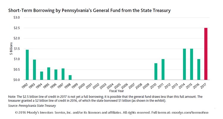 With the state treasury running low on cash, Pennsylvania has authorized borrowing up to $2.5 billion from auto-registration fees, lottery sales and other special-purpose funds -- "the largest such borrowing in its history" -- so it can keep spending until new cigarette taxes, gambling license fees and next year's income taxes start flowing to Harrisburg, writes Dan Seymour, analyst at Moody's Investors Service, in a report to clients today.