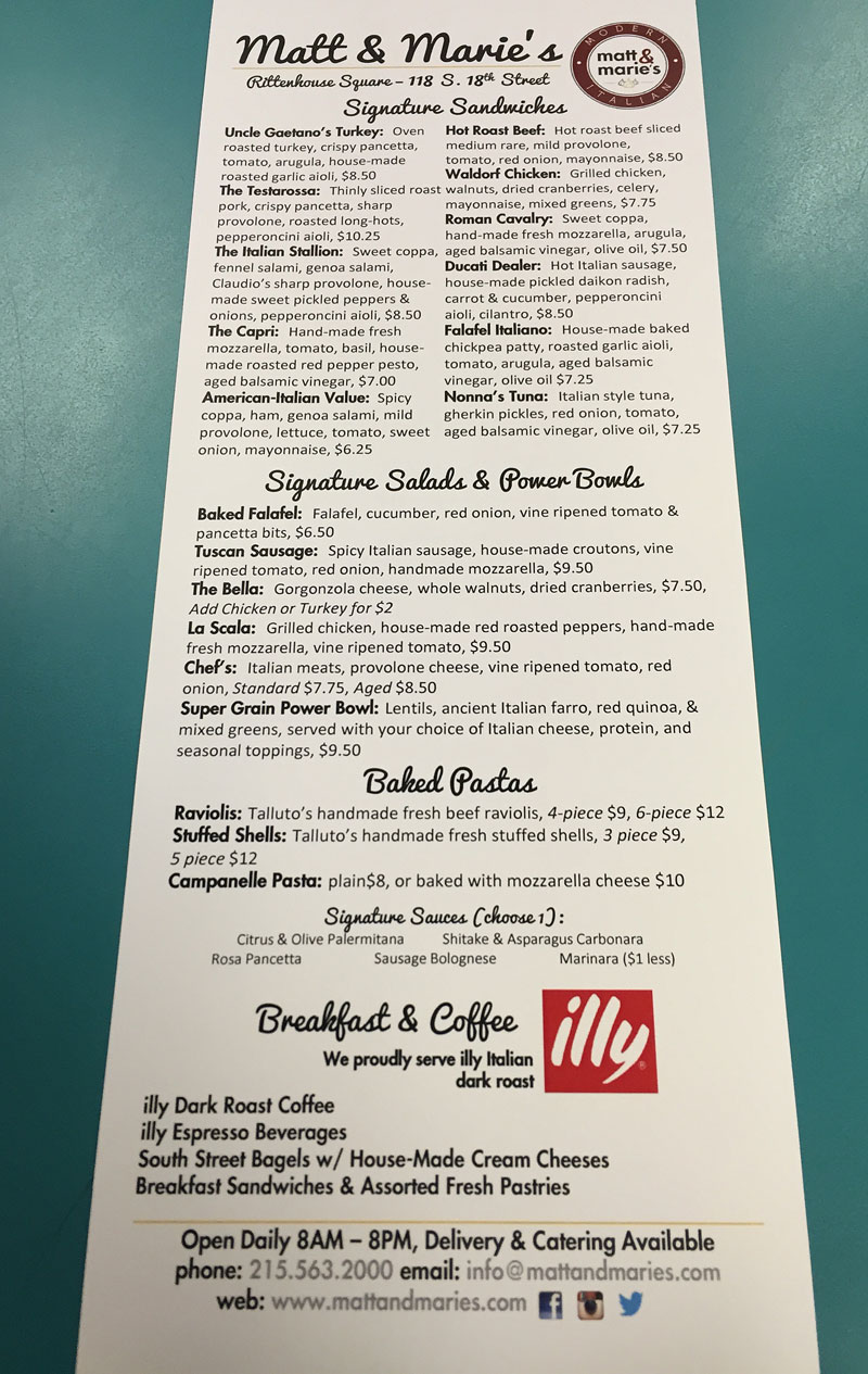 Nicole Capp and Justin Sapolsky took their business plan for a modern Italian sandwich shop into the real world just after their graduation from the Wharton School, opening Matt & Marie's in June 2014 in 2 Logan Square (18th Street above Arch).