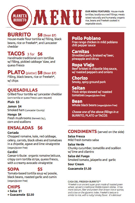 The tortillas are made in house, the beans, freekeh, and organic rice are all cooked in vegetable stock, and the fillings are all locally sourced. Pork comes from Country Time Farms, chicken from Bell & Evans, seitan from Ray's and vegetables from Green Meadow Farm.