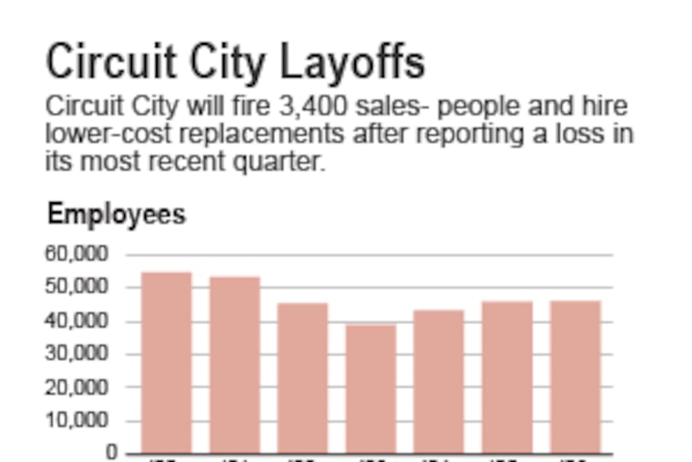 NEW YORK - Circuit City, the electronics retailer facing larger competitors and falling sales, said yesterday that it would lay off about 3,400 store workers and replace them with lower-paid new hires.