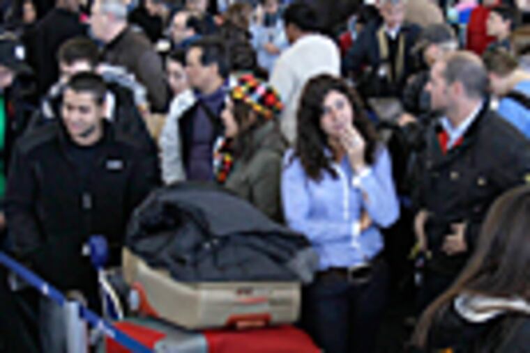 About 305 passengers stayed overnight at Philadelphia airport Monday, compared with 1,215 the night before.The winter storm continued to strand travelers in many places as airlines scrambled to rebook passengers on thousands of canceled flights. Some may wait days for seats on already crowded planes.