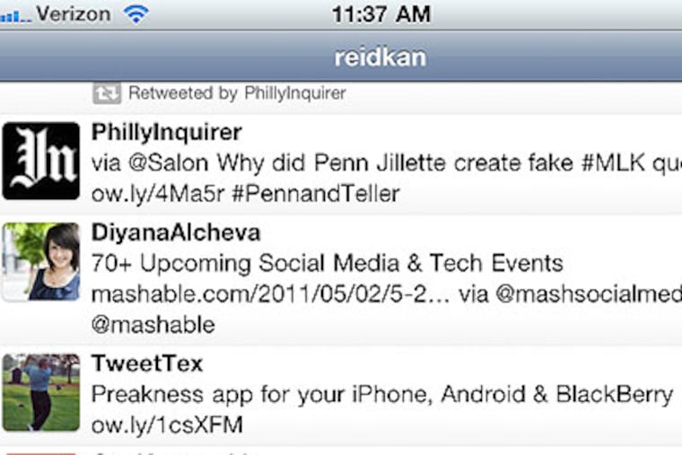 A "mute" button allows you to turn off, or squelch, unwanted users, keywords, and even other apps that people use to post to Twitter. And if you want to tweet a Web page, the application will automatically shorten the URL.